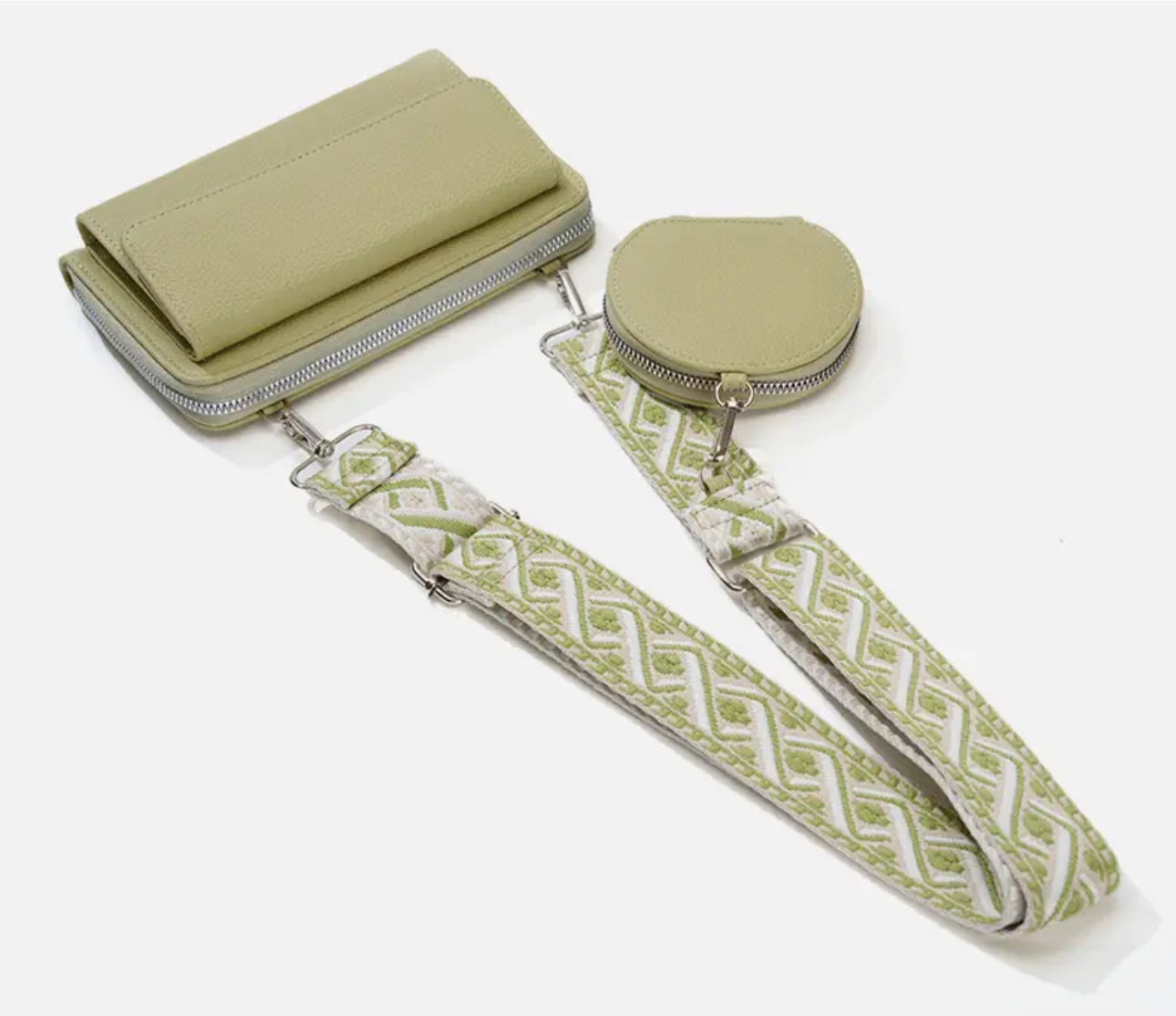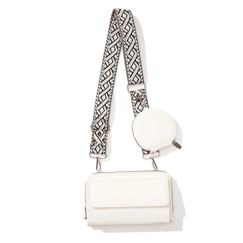 These feature 2 compartments, one with a flap for a phone (larger phones, cases, or accessories may not fit, please check the measurements of your specific phone) and one zip around wallet. It comes with a removable strap!