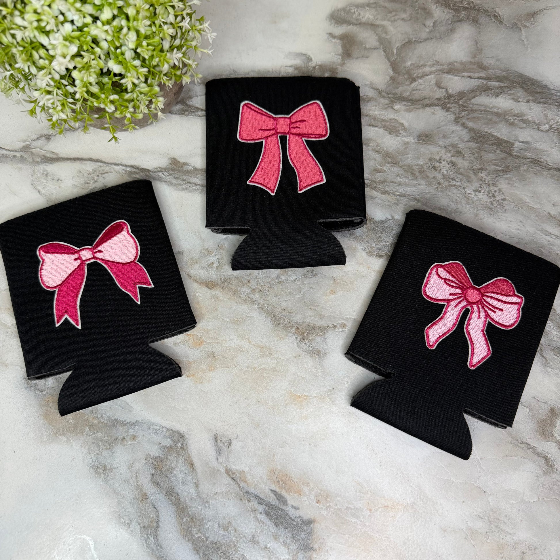 Approx. 4” tall x 4” wide x 2” base, solid black with an assortment of different bows. Holds 12oz regular cans 16oz tall cans or 500ml bottles