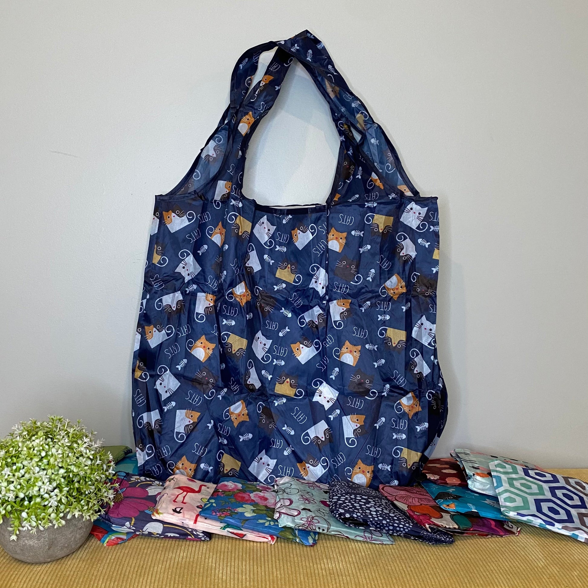 These thin nylon, raincoat-like material totes are sold individually in their carrying case as a random mix.